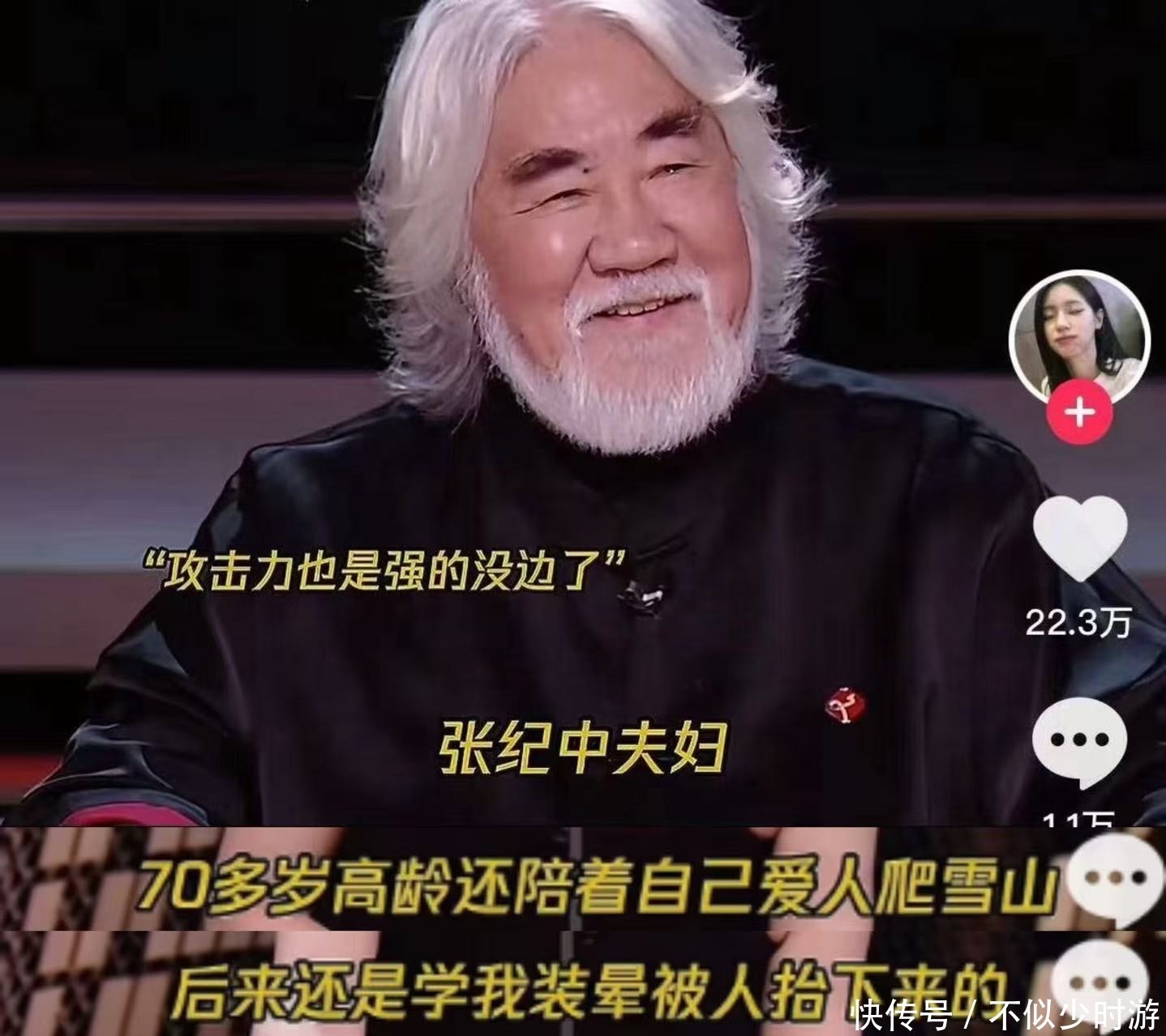 她说“张纪中70多岁半夜去新疆爬雪山,后来还是学她装晕,被人抬下来的。”